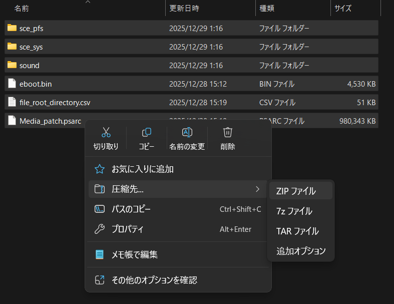 Then, you copy and paste the folder to your PC using VitaShell. Open the folder, select all files & folders in it (e.g., the “sce_sys” folder), and compress them into a zip file.